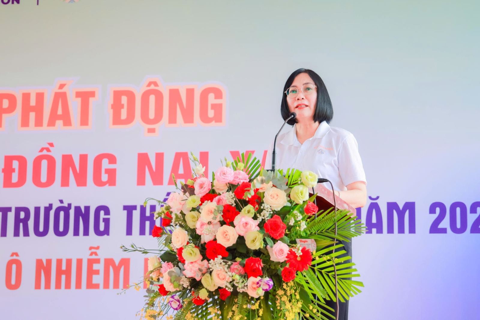 Phó Chủ tịch UBND tỉnh Nguyễn Thị Hoàng phát biểu tại Lễ phát động Tuần lễ Đồng Nai xanh, hưởng ứng Ngày Môi trường thế giới 05/6 năm 2025 tại huyện Định Quán.